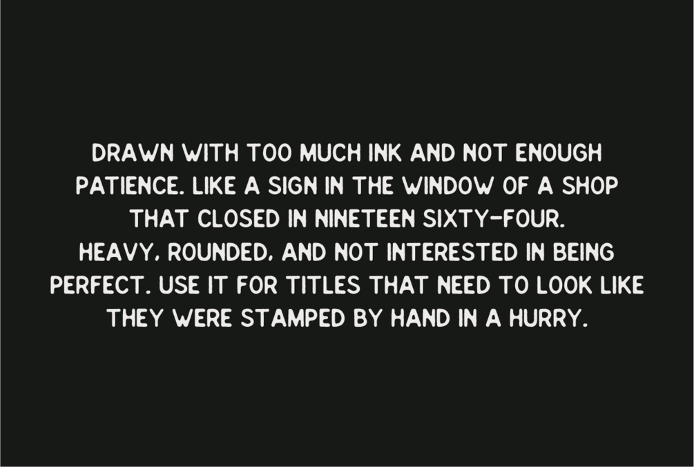 Misplaced Pen is a bold, tactile display font inspired by the charming grit of mid-century letterpress and worn-out hand-painted signage. It looks like a sign in the window of a shop that’s been closed since 1964—heavy, rounded, and unapologetically imperfect.